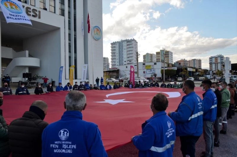 Mezitli Belediyesi hizmet binası önündeki törende saygı duruşunda bulunup, İstiklal Marşı okuyan katılımcılar, şehitler için meşale de yaktı.