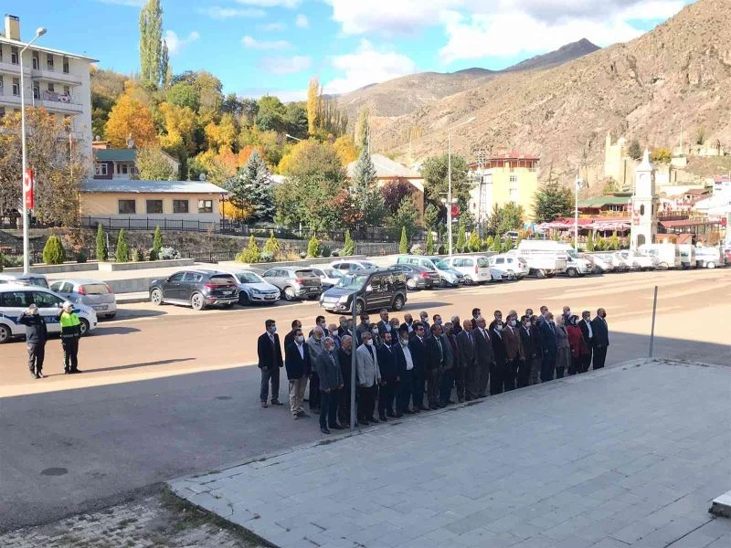 İspir Meydanında Atatürk Anıtına çelenk sunumu yapan muhtarlar saygı duruşunda bulundu, İstiklal Marşı’nı okudu.