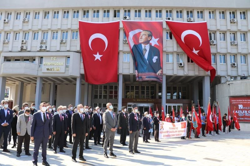 Atatürk Anıtı önünde gerçekleştirilen törene, AK Parti Zonguldak Milletvekili Ahmet Çolakoğlu, Zonguldak Valisi Mustafa Tutulmaz, Cumhuriyet Başsavcısı Abdürrahim Alan, Belediye Başkanı Ömer Selim Alan ve protokol üyeleri katıldı. Tören, anıta çelenk sunma ile başladı. Törende sırasıyla Valilik, Belediye Başkanlığı ve Türkiye Muharip Gaziler Derneği Zonguldak Şube Başkanlığı çelenkleri bırakıldı. Çelenklerin sunulmasının ardından saygı duruşu ardından da İstiklal Marşı eşliğinde Türk Bayrağı göndere çekildi. Tören, günün anlam ve önemini belirten konuşma ile devam etti. Muharip Gaziler Derneği Başkanı Necmettin Çantaş, günün anlam ve önemini içeren konuşma yaptı. Çantaş, "19 Eylül muharebe meydanlarında canlarını ortaya koyarak savaşan, fedakar ve kahraman gazilerimizin şeref ve kahramanlık günüdür. 19 Eylül gazilerin Gazi Mustafa Kemal Atatürk ile bütünleştiği gündür. Bu gün de bu kutlu günün 100. yılı olması münasebetiyle beraberiz. Gururla taşıdığımız gazilik unvanı Atamız’dan bize en büyük mirastır. Kahraman Gaziler, Gaziler Gününüz kutlu olsun. Sizler en büyük gazi Mustafa Kemal Atatürk’ün yaşayan birer temsilcilerisiniz. Sizler şehitlerimizle beraber Cumhuriyetimizin temel taşlarısınız" diye konuştu.