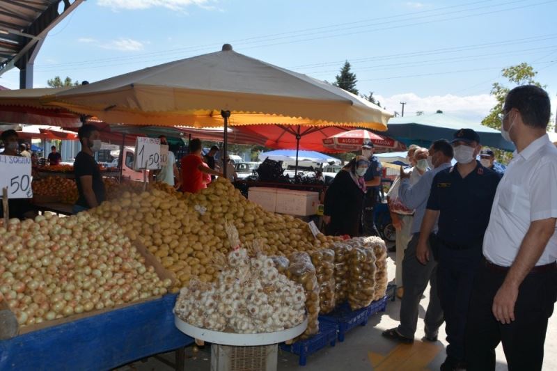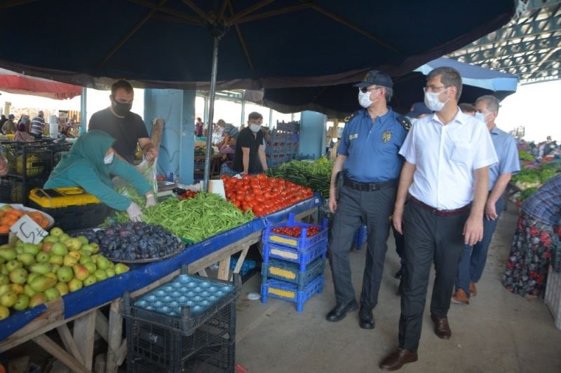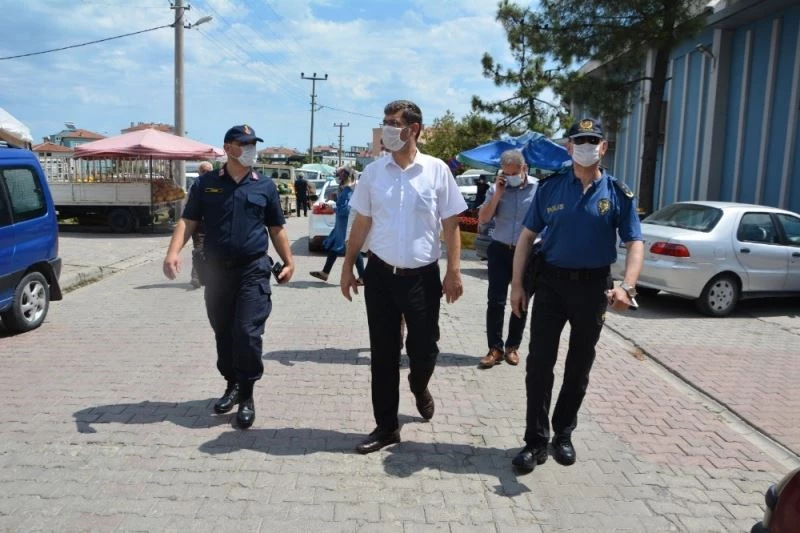 Samsun 19 Mayıs İlçe Kaymakamı İbrahim Civelek, kurum amirleri ile birlikte 19 Mayıs Çok Programlı Pazar Yerinde maske denetimi yaptı.