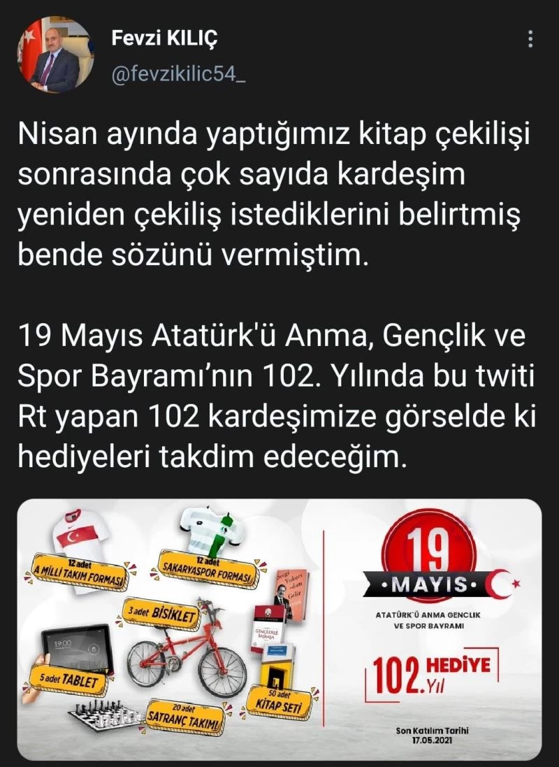 Erenler Belediye Başkanı Fevzi Kılıç, şahsi sosyal medya hesabından gerçekleştirdiği kitap çekilişi sonrasında 19 Mayıs Atatürk’ü Anma, Gençlik ve Spor Bayramı’nın 102’nci yılı dolayısıyla yeni bir çekiliş yapmaya karar verdi. Sosyal medyadan başlatılan çekilişle 102 kişiye, 50 adet kitap seti, 12 adet milli forma, 12 adet Sakaryaspor forması, 3 adet bisiklet, 5 adet tablet ve 20 adet satranç seti hediye edilecek. Başkan Kılıç sosyal medya hesabından çekiliş ile ilgili yaptığı açıklamada, “Nisan ayında yaptığımız kitap çekilişi sonrasında çok sayıda kardeşim yeniden çekiliş istediklerini belirtmiş bende sözünü vermiştim. 19 Mayıs Atatürk’ü Anma, Gençlik ve Spor Bayramı’nın 102’nci yılında bu paylaşımı beğenerek kendi hesabında paylaşan 102 kardeşimize görselde ki hediyeleri takdim edeceğim” ifadelerini yer verdi.