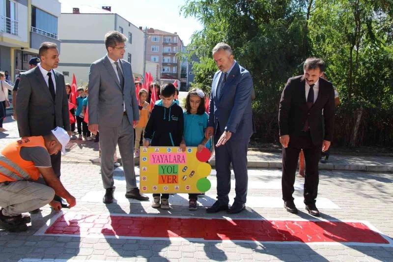 Cumhuriyet İlkokulu önünde düzenlenen programda yaya geçidinin önemine dikkat çekildi. Yaya ve okul geçitleri öncesinde okul önünde bulunan yaya geçidine kırmızı çizgi çekilerek sürücüler uyarıldı.