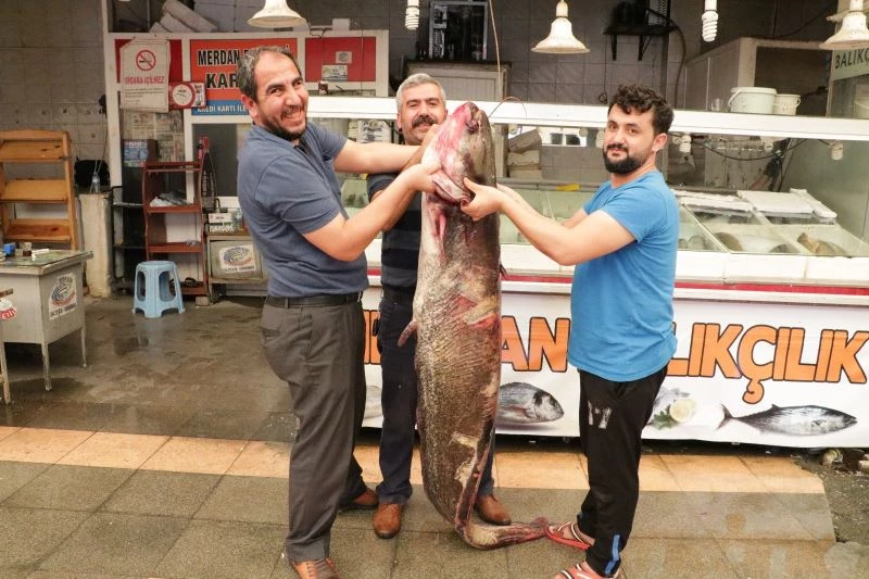 Şazibey Balık Pazarı’nda sergilenen balığı gören vatandaşlar ise hatıra fotoğraf çektirmeyi ihmal etmedi.