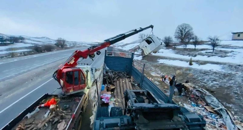 Afyonkarahisar’ın Bolvadin ilçesinde iki tırın çarpıştığı kazada 1 kişi hafif şekilde yaralanırken, kazada çarpışan tırlardan birinin kupası metrelerce öteye fırladı.