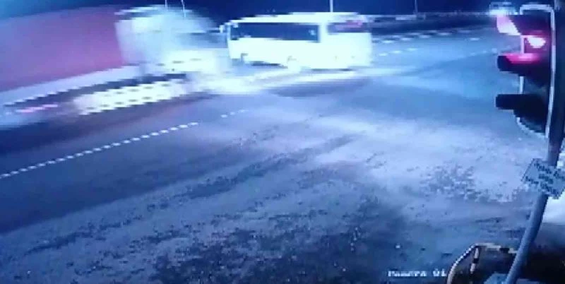 Uşak’ta dün gece R.B. idaresindeki 35 HD 3428 plakalı tırın E.O. idaresindeki 64 S 0282 plakalı tıra çarpması sonucunda 20 kişi yaralanmıştı. Meydana gelen kaza anı, bölgede bir firmanın güvenlik kamerasına yansıdı. Görüntülerde kırmızı ışık ihlali yapan tırın servis aracına çarptığı anlar yer aldı.