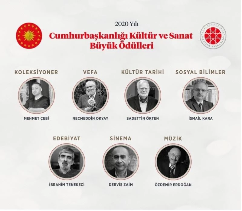 “2020 Yılı Cumhurbaşkanlığı Kültür Sanat Büyük Ödülleri”nin sahipleri açıklandı. Ödüllerin bu yıl Mehmet Çebi, Necmeddin Okyay, Sadettin Ökten, İsmail Kara, İbrahim Tenekeci, Derviş Zaim ve Özdemir Erdoğan’a verilmesi kararlaştırıldı.