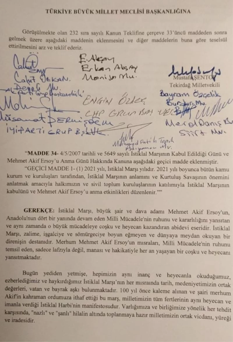 Türkiye Çevre Ajansı’nın Kurulmasına ilişkin kanun teklifi görüşmeleri devam ediyor. Teklifin 33 maddesinden sonra gelmek üzere 2021 yılı İstiklal Marşı yılı olduğu belirtiliyor. 2O21 yılı boyunca bütün kamu kurum ve kuruluşları tarafından, İstiklal Marşının anlamını ve Kurtuluş Savaşının önemini anlatmak amacıyla halkın ve sivil-toplum kuruluşlarının katılımıyla istiklal Marşının kabulünü ve Mehmet Akif Ersoy’u anma etkinlikleri düzenlenecek.