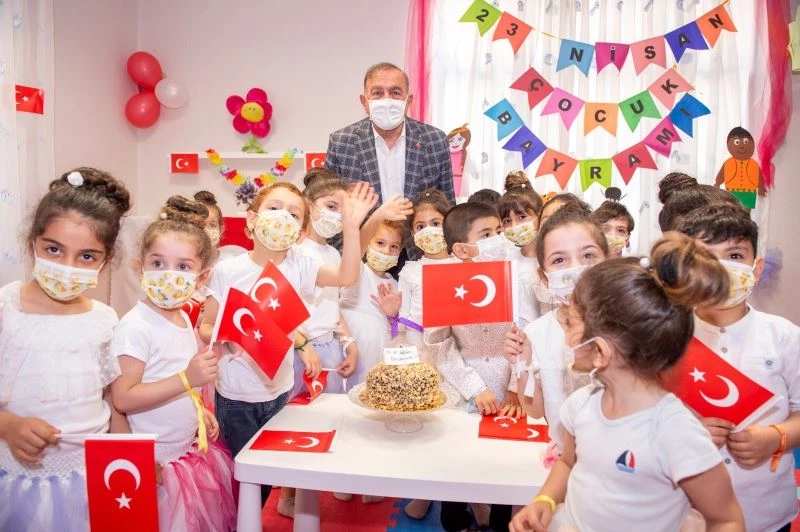 Yenibey SEYMER’de düzenlenen etkinlikte ellerindeki bayraklarla marşlar söyleyen çocuklar, Başkan Akay’a doğum günü sürprizi yaptı. Çocuklarla birlikte hazırlanan pastadaki mumları söndüren Başkan Akay, çocuklara oyuncaklar armağan ederek, 23 Nisan coşkularına ortak oldu.