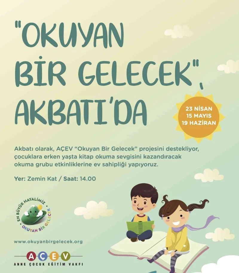 Akiş GYO A.Ş. yatırımlarından olan Akasya ve Akbatı, 23 Nisan Ulusal Egemenlik ve Çocuk Bayramı’nda Anne Çocuk Eğitim Vakfı’nın (AÇEV) ‘Okuyan Bir Gelecek’ hayaline ortak olacak. 23 Nisan tarihinde düzenlenecek ‘Okuyan Bir Gelecek’ okuma grubu etkinliğine çocuk kitabı yazarları Gökçe Gökçeer ve Özge Bahar Sunar da katılarak çocuklar ve aileleriyle birlikte kitap okuyacak.