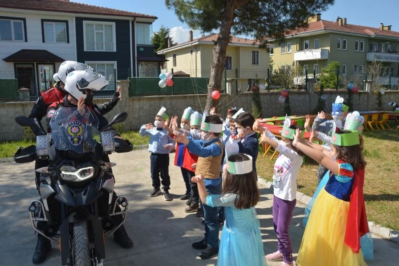 Salgın tedbirleri kapsamında 23 Nisan’da getirilen kısıtlama öncesinde etkinlik düzenleyen anaokulu öğrencilerine Sakarya İl Emniyet Müdürlüğünde görevli polis memurları eşlik etti.