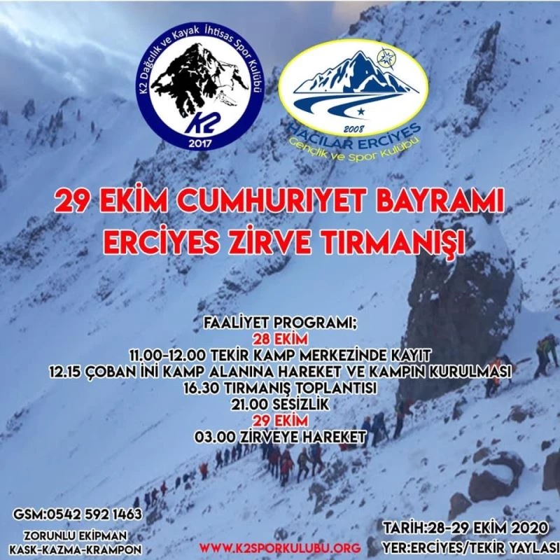 Hacılar Erciyes Gençlik ve Spor Kulübü ile K2 Dağcılık ve Kayak İhtisas Spor Kulübü tarafından 29 Ekim’de Cumhuriyet Bayramı Erciyes Zafer Tırmanışı düzenlenecek.