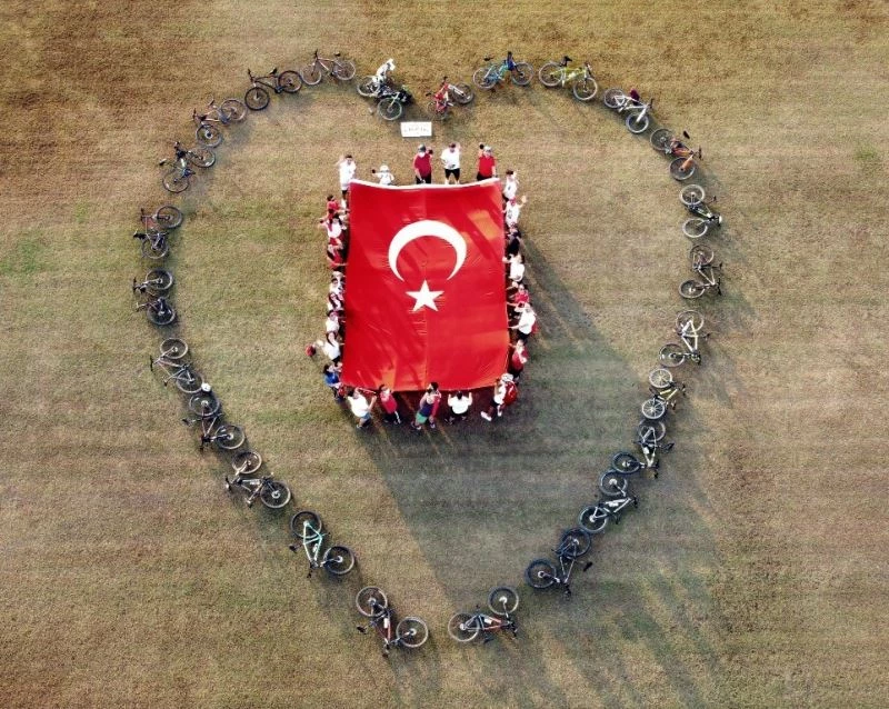Hatay’ın Erzin ilçesinde, bisikletlerle kalp figürü oluşturularak dev Türk bayrağı dalgalandırıldı.