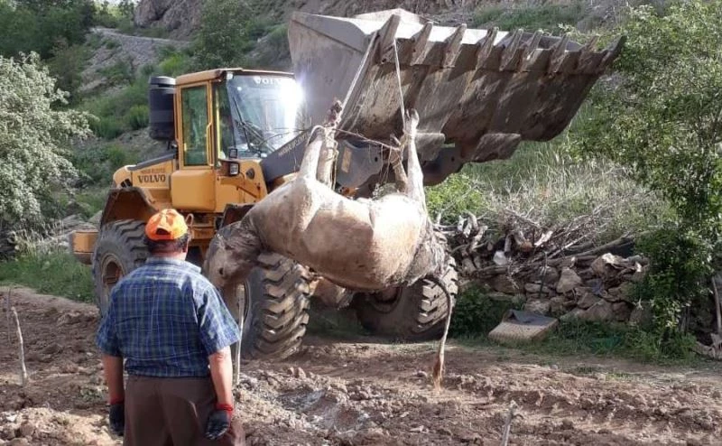 Hakkari’de 3 ailenin banka kredisi ile aldığı ancak dereye düşerek boğulan inek, belediye ekipleri tarafından açılan çukura gömüldü.
