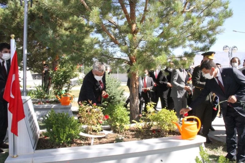 Törende Erzincan Valisi Mehmet Makas, 3. Ordu Kurmay Başkanı ve Garnizon Komutanı Tuğgeneral Davut Ala, Erzincan Belediye Başkanı Bekir Aksun, Atatürk anıtına çelenk sunarak, saygı duruşunda bulundular.