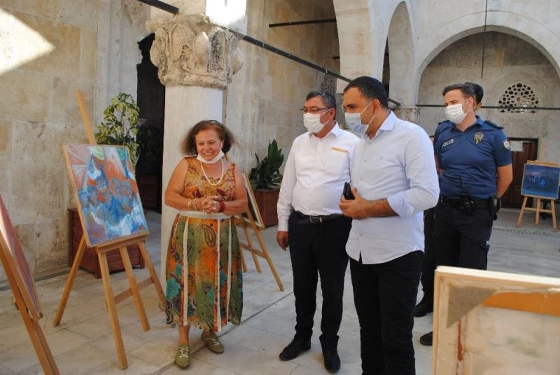 Serginin açılışını yapan Kaymakam Çelik ve beraberindekiler, Hatice Oya Kuzgun’un tablolarını tek tek inceleyerek bilgi aldı.