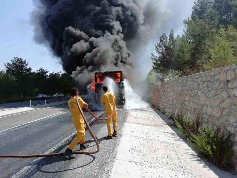 İçeresinde 36 yolcusu bulunan 61 BB 553 plakalı Kamil Koç firmasına ait otobüsün arka bölümünde başlayan yangın sonrası bölgede konuşlu Muğla Orman Bölge Müdürlüğü Yılanlı Orman İşletme Şefliğinde görevli arazöz ekipleri ilk müdahaleyi yaptı.