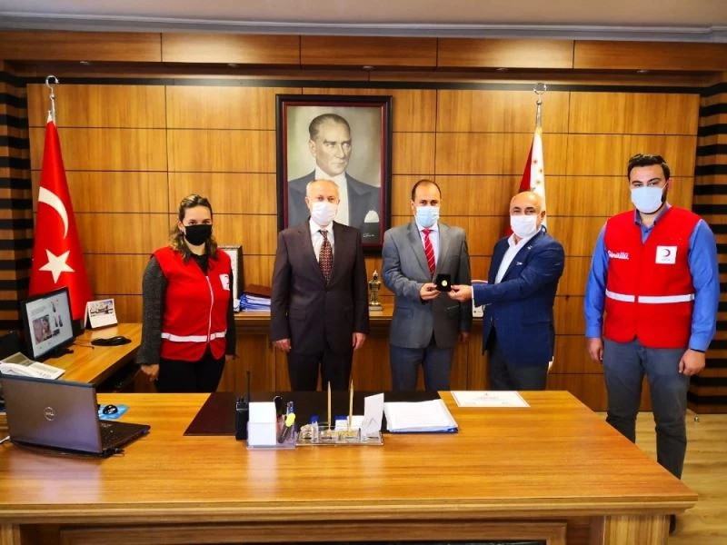 Türk Kızılay Bilecik Şubesi Başkanı Mefail Ateş, Genç Kızılay Bilecik İl Başkanı Mehmet Aydın ve Şube Genel Hizmet Yöneticisi Nurcan Başhan, Bilecik İl Emniyet Müdürü Ertuğrul Namal’ı makamında ziyaret etti. Gerçekleştirilen ziyarette 38 kez kan bağışında bulunan polis memuru Selçuk Yeşil’e altın madalya ve teşekkür belgesi verildi. Altın madalya ve teşekkür belgesi İl Emniyet Müdürü Ertuğrul Namal ve Türk Kızılay Bilecik Şubesi Başkanı Mefail Ateş tarafından takdim edildi.