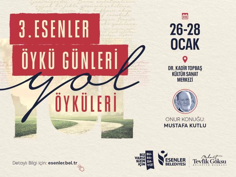 Esenler Belediyesi, Evliya Çelebi Kültür Sanat Sezonu’na özel olarak düzenlediği Esenler Öykü Günleri’nin bu yıl 3’üncüsüne ev sahipliği yapacak. 26-28 Ocak 2023 tarihleri arasında Dr. Kadir Topbaş Kültür Sanat Merkezi’nde gerçekleşecek olan programın onur konuğu ise yazar Mustafa Kutlu olacak.