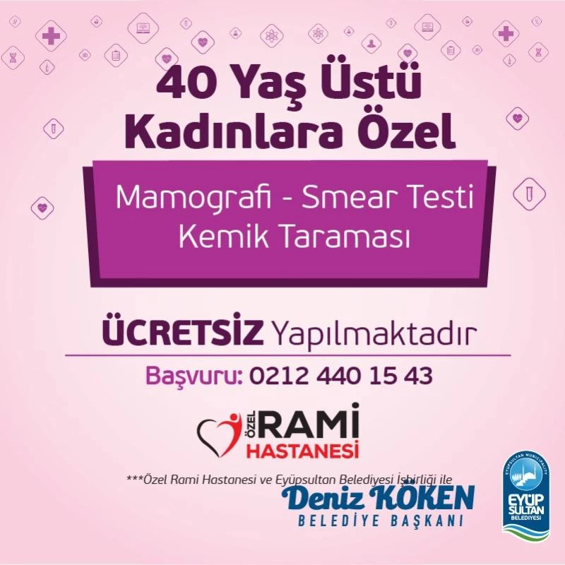 Eyüpsultan Belediyesi, Özel Rami Hastanesi işbirliği ile 40 yaş üstü kadınlara özel yeni bir sağlık çalışması başlattı. 40 yaş üstü kadınlar, mamografi, smear testi ve kemik taramasını ücretsiz olarak yaptırabilecekler.