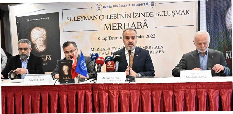 Kitaba katkı koyan 17 yazarın da katıldığı tanıtım toplantısında konuşan Bursa Büyükşehir Belediye Başkanı Alinur Aktaş, 2022’nin Cumhurbaşkanı Recep Tayyip Erdoğan ve UNESCO tarafından da “Süleyman Çelebi Yılı” ilan edildiğini hatırlatarak, Süleyman Çelebi’nin vefat yıldönümü vesilesiyle sergiler, sempozyumlar ve mevlit okuma programları gerçekleştirdiklerini söyledi. Konuşmasında halen başkanlık konutunun bulunduğu alana kazandırılacak Süleyman Çelebi Külliyesi’ne de değinen Başkan Aktaş, “Süleyman Çelebi Türbesi, Büyükşehir Belediyesi Başkanlık Konutu, Karagöz Müzesi ve STK tarafından kullanılan yapının da içinde bulunduğu yaklaşık 28 bin metrekarelik alanla ilgili projemiz bakanlık tarafından onaylandı. Ben de bir ay sonra evimi taşıyorum. Bu alanda siyer ve mevlid merkezi, mescit, kitap-kafe ve dinlenme alanları yer alacak. Uygulayacağımız proje sayesinde burası özellikle gençlere hitap eden bir alan olacak. İnanıyorum ki Süleyman Çelebi ve mevlidin, daha fazla bilinmesine ve anlaşılmasına da vesile olacaktır. Bugün tanıtımını yaptığımız ‘Süleyman Çelebi’nin İzinde Buluşmak-Merhaba’ kitabı, birbirinden değerli 40 yazarı buluşturan ve bu alanda çalışma yapanlara da ilham olacak nitelikte bir eserdir. Bu vesileyle, başta Prof. Dr. Bilal Kemikli hocamız olmak üzere katkıda bulunan bütün yazarlarımıza, hattatımıza ve sanatçılarımıza hassaten teşekkür ediyorum” diye konuştu.