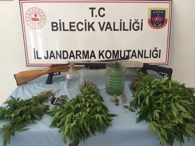 Bilecik İl Jandarma Komutanlığı ekiplerince yapılan Söğüt ilçesi Küre köyünde V.K. isimli şahsa ait ev ve ormanlık alanda yapılan arama sonucunda 168 gram kubar esrar, 414 kök kenevir bitkisi, uyuşturucu kullanmaya yarayan aparat, 1 adet ruhsatsız av tüfeği ile 12 adet av tüfeği fişeği ele geçirildi. Şüpheli V.K. alınan ilk ifadesinin ardından Söğüt Adliye Sarayı’na sevk edildi ve çıkarıldığı mahkemece tutuklanarak cezaevine gönderildi.