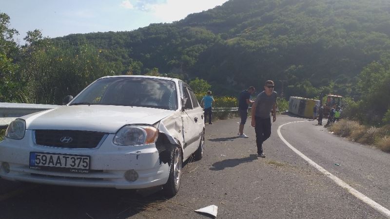 Tekirdağ Şarköy ilçesinde otomobille çarpışan ve içerisinde bir aile olan midibüs 50 metrelik uçurumdan düşmekten direk sayesinde kurtuldu. Kazada yaralanan 3 kişi hastanede tedavi altına alındı.