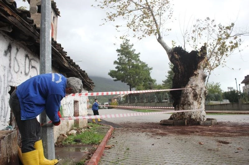 Arslanbucak Mahallesi’nde yol ortasında bulunan ve bakımsızlıktan bir bölümü daha önce devrilen 500 yaşındaki çınar ağacı, sağanak yağış ve rüzgardan etkilendi. Çınar ağacının büyük bir bölümü devrildi. Yoldan geçen bir vatandaş, çınarın devrildiğini fark edince belediye ekiplerine haber verdi. Ekipler tarafından yol temizlenirken, ağacın kalan bölümünün kesilip kesilmeyeceğine karar verilene kadar yolun bir bölümü güvenlik bantlarıyla kapatıldı.
