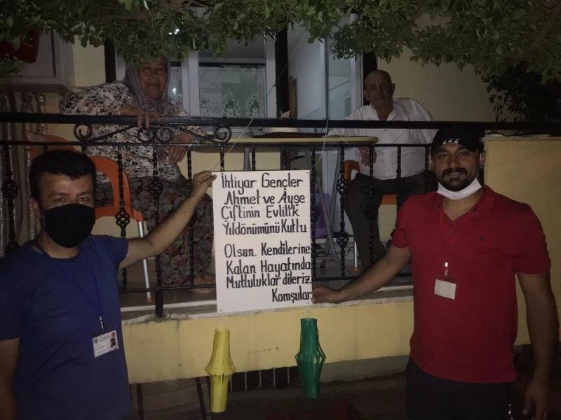 İzmir’in Tire ilçesinde Ayşe ve Ahmet Ercan çifti, 56’ıncı evlilik yıl dönümlerini Vefa Destek Grubu görevlilerinin pastalı sürprizi ile kutladı.