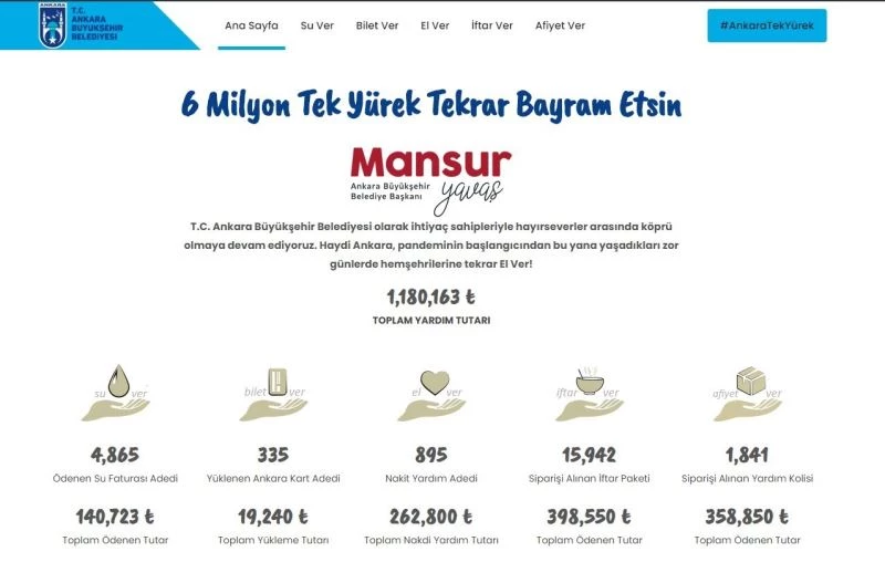 Büyükşehir Belediyesi, ödenen destek tutarları ve yapılan yardım miktarlarını anlık olarak www.ankaratekyurek.com adresinden yayınlanmaya devam edileceği belirtti. “www. ankaratekyurek.com” adresi üzerinden anlık olarak açıklanan verilere göre; 2 Nisan 2021 tarihi itibarıyla toplam yardım tutarı 1 milyon 187 bin 842 TL’ye ulaştı. Hayırsever vatandaşlar; Su faturası, Ankarakart yükleme, Nakit yardımı, İftar Paketi ve Yardım kolisi seçeneği ile sadece Ankara’dan değil diğer illerden ve yurt dışından da kampanyaya yoğun ilgi gösterdi. İlk 24 saatte; “Su Ver” ile 142 bin 590 TL’lik 4 bin 908 adet su faturası ödenirken, “Bilet Ver” ile 19 bin 402 TL’lik 337 Ankarakart’a yükleme yapıldı. “El Ver” ile 900 adet nakit yardımıyla toplam 263 bin 900 TL yardım toplanırken, “İftar Ver” ile 16 bin iftar paketi sipariş edilerek, 400 bin 250 TL’lik yardım oranına ulaşıldı. “Afiyet Ver” ile de 361 bin 700 TL’lik bin 858 adet yardım kolisi desteği sağlandı.