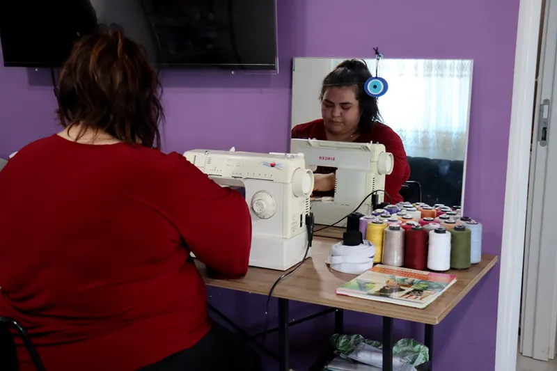 Evinin bir köşesini dikim atölyesine çeviren Geller, hem derneğin hem de mahallelinin siparişlerini dikerek ek kazanç elde ediyor.