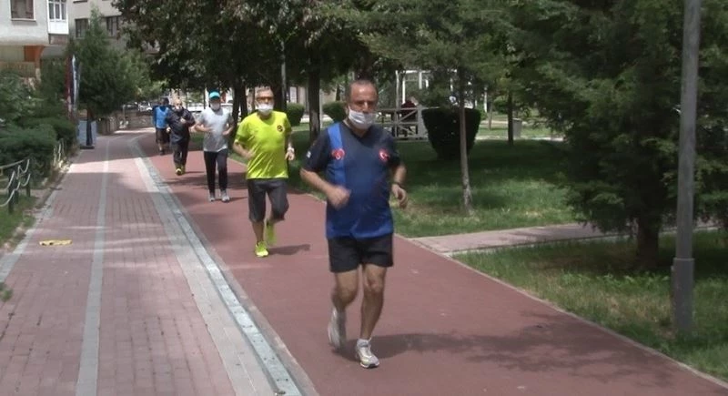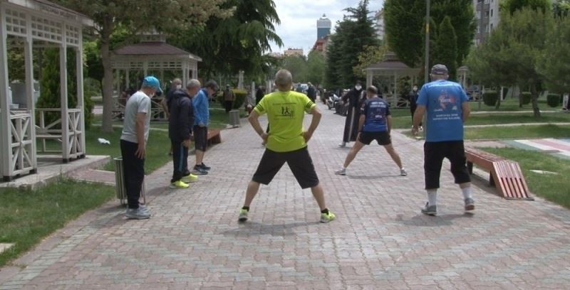 Konya’da atletizm yarışlarında dereceye giren 65 yaş üstü 10 kişilik sporcu grup, sokağa çıkma kısıtlamasında verilen izinde bir araya gelerek parkta spor yaptı.