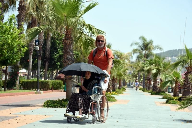 Sicakligin 40 dereceyi astigi kentte bazi yaslilar, semsiye ve sapkalariyla sokaklarda yürüyüs yapti bazilari ise agaçlarin altindaki banklarda oturarak denizi seyretti.