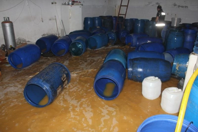 Adana Emniyet Müdürlüğü Kaçakçılık ve Organize Suçlarla Mücadele Şube Müdürlüğüne bağlı Kaçakçılık Büro Amirliği ekipleri Toptancılar Sitesinde bir iş yerinin kiralanarak sahte içki üretildiği bilgisine ulaştı. İş yerine yapılan operasyonda bidonlara konmuş halde 7 bin 300 litre sahte içki ele geçirildi.