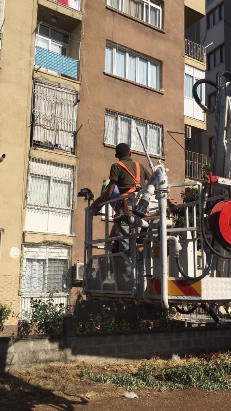 7. katta iskelede asılan kalan boyacının imdadına itfaiye yetişti