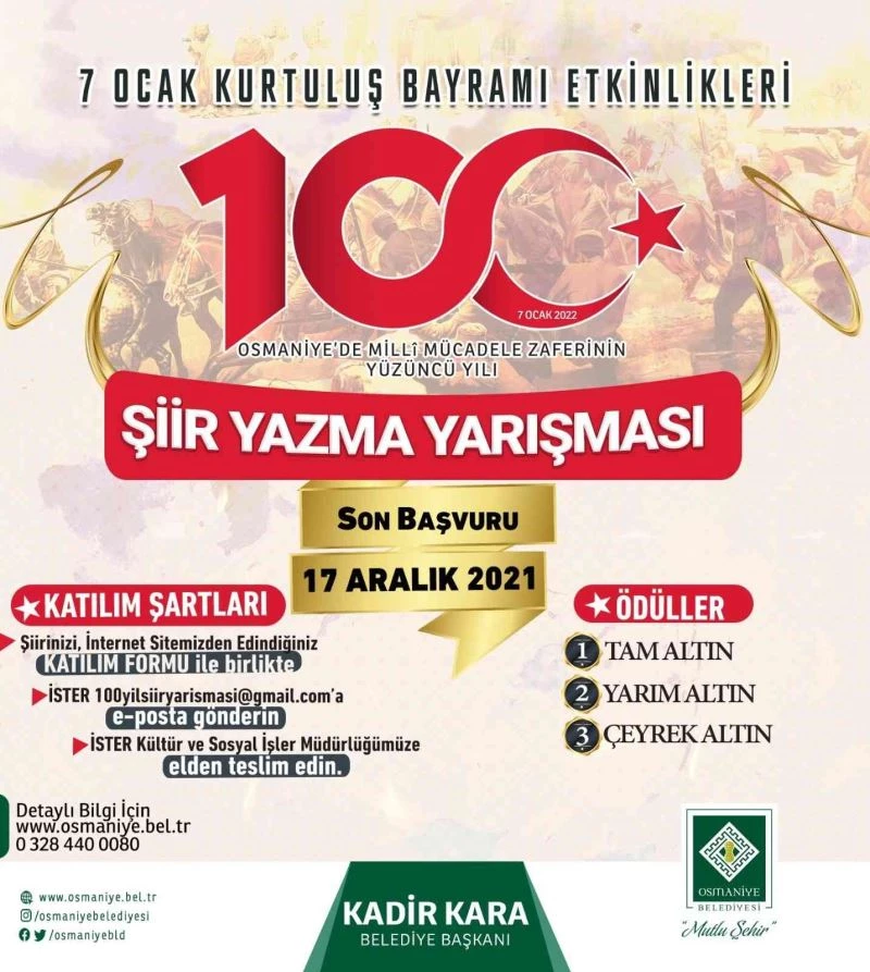 Osmaniye Belediyesi’nin öncülüğünde kentin düşman işgalinden kurtuluşunun 100’üncü yılı etkinlikleri çerçevesinde şiir yazma yarışması düzenlendi. 7 Ocak 1922’den bugüne gururla kutlanan ‘7 Ocak Kurtuluş Bayramı’nda şiir yazma yarışmasına tek kategoride Türkiye’nin her yerinden her yaşta vatandaşlar katılabilecek.