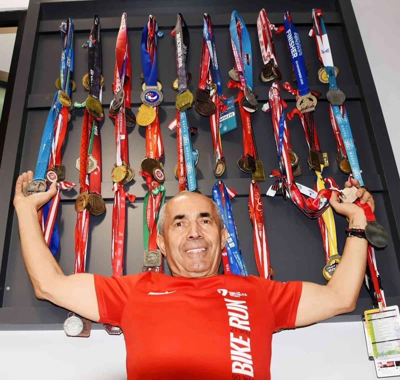 Antalya’da hastalıkları yüzünden 35 yıl ilaçlarla yaşadıktan sonra yaptığı sporla Türkiye’nin gündemine oturan ve ‘Demir adam’ lakabıyla dikkatleri çeken 73 yaşındaki Ali Bıdı, madalya ve kupalara doymuyor.