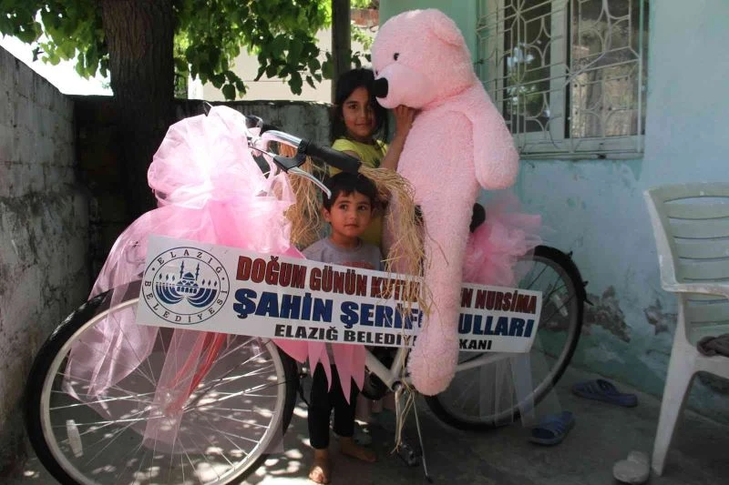Elazığ’da yaşayan Yağmur ve Şerafettin Turan çiftinin ilk çocuğu bağırsakta daralma hastası Nursima Turan, doğum günü dolayısıyla sosyal medya üzerinden bir video paylaşarak Belediye Başkanı Şahin Şerifoğulları’ndan bisiklet istedi. Belediye personellerinin videoyu izletmesi üzerine talimat veren Başkan Şerifoğulları, bisiklet ve çeşitli oyuncaklar alınmasını istedi. Belediye personelleri tarafından bisiklet, çeşitli oyuncaklar ve doğum günü pastası alınarak Nursima’nın doğum günü kutlandı. İstediği bisiklet ve oyuncakları gören Nursima Belediye Başkanı Şahin Şerifoğulları’na teşekkür ederek mutluluğunu dile getirdi.