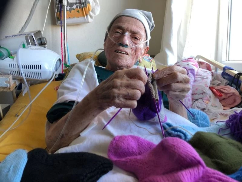 Rize’nin Pazar ilçesinde yaşayan 80 yaşındaki KOAH hastası Meliye Nine, hasta yatağında Türk askerine üşümesin diye yün çorap örüyor.