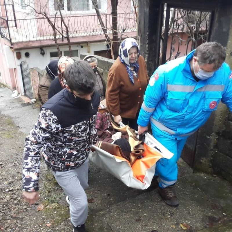 Zonguldak’ın Karaelmas Mahallesinde evinde fenalaşan 86 yaşındaki Dudu Savaş, yol olmadığı için sağlık görevlileri elde taşıyarak ambulansa götürdü.
