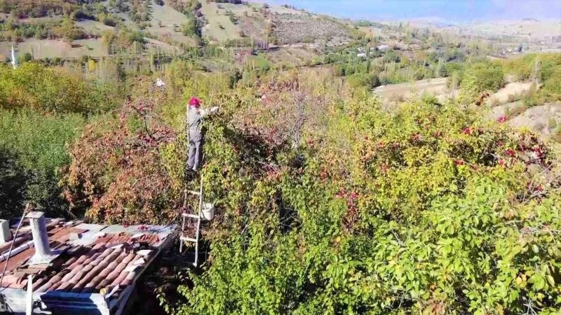 Amasya’da 90 yaşına merdiven dayayan Ahmet Aydoğan elleriyle diktiği metrelerce yüksekteki elma ağaçlarına merdivenle tırmanıp en üst basamakta meyve topluyor.