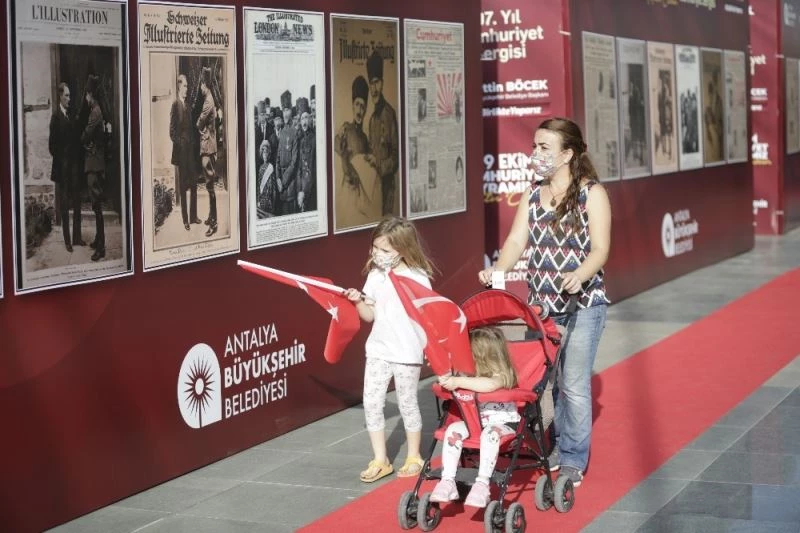 Antalya Büyükşehir Belediyesi, Cumhuriyetin 97. Yılı kutlamaları kapsamında Cumhuriyet Meydanı’nda da etkinlik alanı oluşturdu. Kurtuluş Savaşı’ndan Cumhuriyetin ilanına kadar olan süreci anlatan gazete manşetlerinden oluşan sergi büyük ilgi görüyor. Alanı ziyaret edenler arttırılmış gerçeklik teknoloji stantlarında Atatürk’ün 3 boyutlu görseli ile fotoğraf çektirebilme şansına da sahip oluyor.