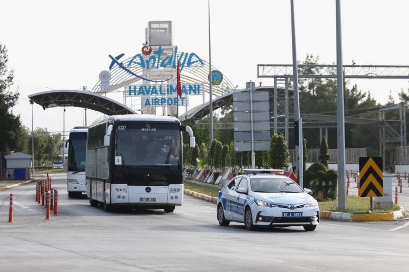 Havalimaninda bekleyen saglik ekiplerince kontrolden geçirilen 349 kisi, sosyal mesafe kuralini dikkate alarak, otobüslere bindi.
