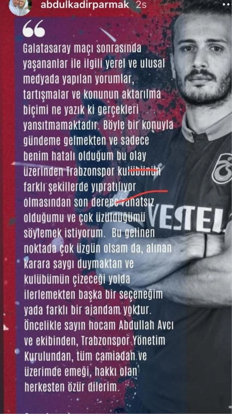 Trabzonspor Teknik Direktörü Abdullah Avcı tarafından disiplinsiz hareketlerinden ötürü kadro dışı bırakılan Abdulkadir Parmak özür diledi.