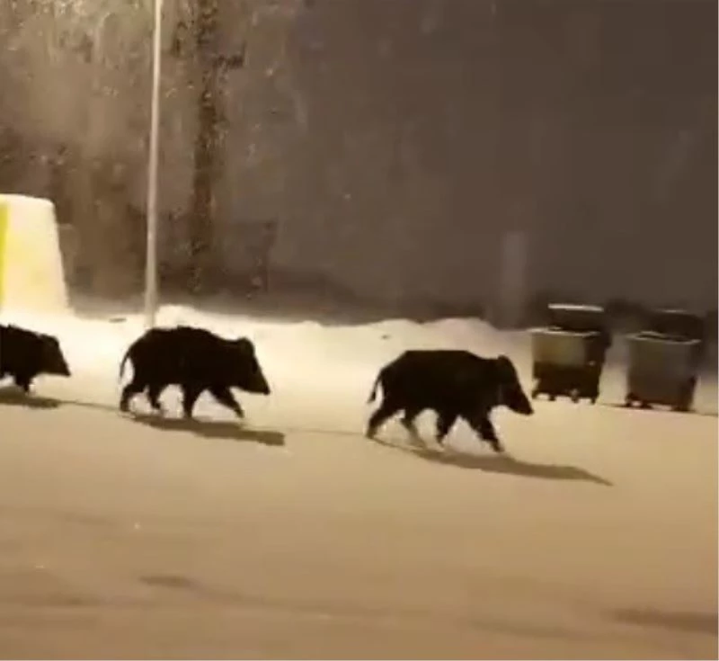 Kütahya’nın Tavşanlı ilçesinde yağan kardan dolayı aç kalan domuzlar, ilçe merkezine inerek yiyecek aradı.