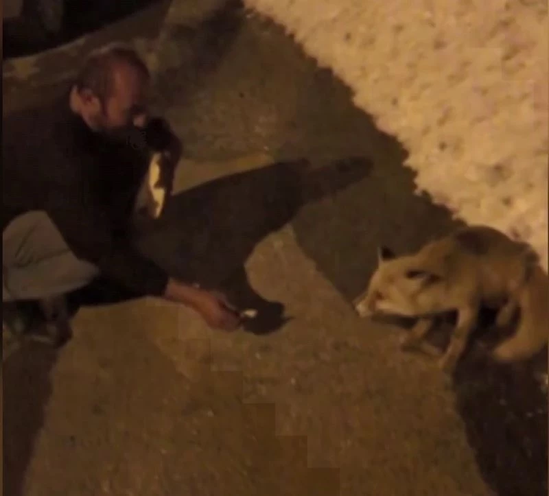 Erzurum’da bir vatandaş soğuk havada yiyecek bulmakta zorlanan tilkiyi elleriyle besledi.
