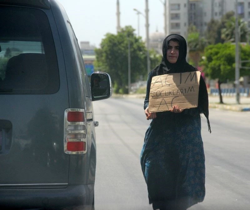 Adana’da bir kadın, kırmızı ışıkta duran araçlar arasında üzerinde "Açım çocuklarım aç" yazılı kartonu göstererek dilencilik yapıyor.