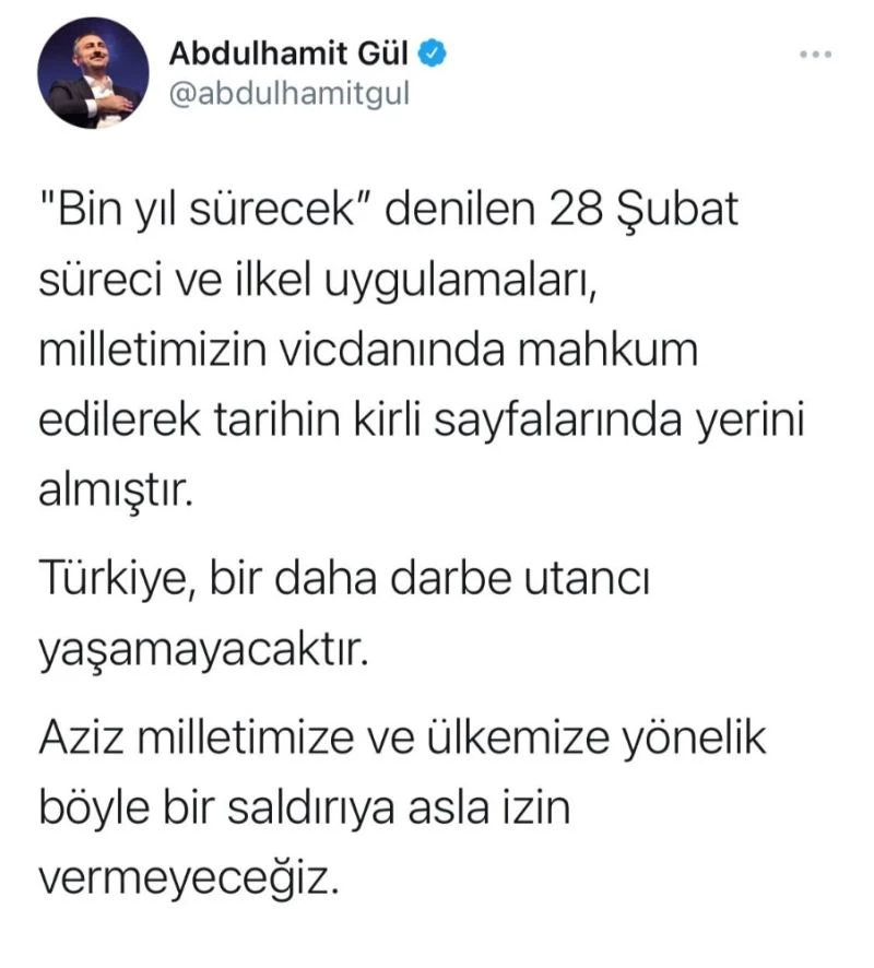 Adalet Bakanı Abdulhamit Gül, 28 Şubat’ın yıl dönümü dolayısıyla sosyal medya hesabından bir paylaşım yaptı. Bakan Gül, sosyal paylaşım sitesi Twitter üzerinden yaptığı paylaşımda, "’Bin yıl sürecek’ denilen 28 Şubat süreci ve ilkel uygulamaları, milletimizin vicdanında mahkum edilerek tarihin kirli sayfalarında yerini almıştır. Türkiye, bir daha darbe utancı yaşamayacaktır. Aziz milletimize ve ülkemize yönelik böyle bir saldırıya asla izin vermeyeceğiz" ifadelerini kullandı.