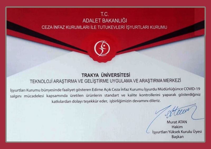 Teşekkür belgesi, Edirne Cumhuriyet Başsavcısı Fatih Karabacak tarafından, Trakya Üniversitesi Rektörü Prof. Dr. Erhan Tabakoğlu ve TÜTAGEM Müdürü Prof. Dr. Şaban Aktaş’a takdim edilirken, Ceza İnfaz Kurumları ile Tutukevleri İşyurtları Kurumu Daire Başkanı Hâkim Murat Atan imzasıyla gönderilen yazıda, “İşyurtları Kurumu bünyesinde faaliyet gösteren Edime Açık Ceza İnfaz Kurumu İşyurdu Müdürlüğünce korona virüsle mücadele için üretilen ürünlerin standart ve kalite kontrollerini yapan Trakya Üniversitesi Teknoloji Araştırma ve Geliştirme Uygulama ve Araştırma Merkezinin göstermiş olduğu takdire şayan katkılarından dolayı teşekkür ederiz” ifadelerine yer verildi.