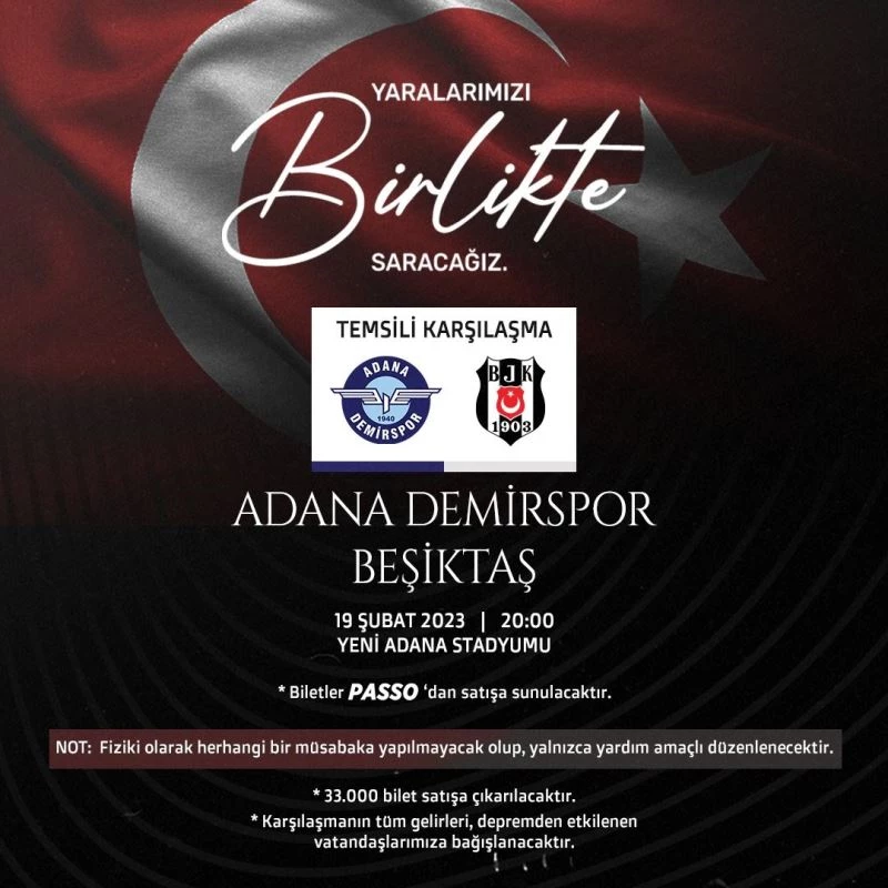 Adana Demirspor ile Beşiktaş, depremzedelere destek olmak için temsili bir karşılaşma yapacak. Fiziki herhangi bir müsabaka oynanmayacak olup, 33 bin bilet satışa çıkacak ve buradan elde edilen gelir depremzedelere bağışlanacak.