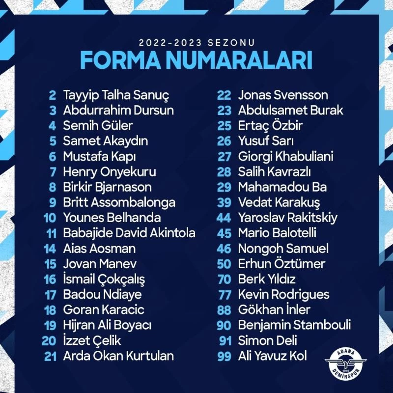 Spor Toto Süper Lig ekiplerinden Adana Demirspor’da futbolcuların yeni sezonda giyecekleri forma numaraları belli oldu. Adı transfer haberleriyle anılan Mario Balotelli’nin ise yeni sezonda 45 numaralı formayı giyeceği duyuruldu.